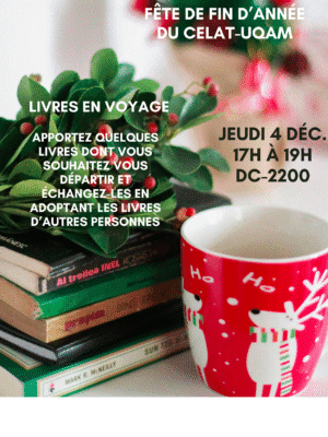 Le CELAT-UQAM invite ses membres à une fête de fin d’année le jeudi 4 décembre, à l’occasion d’un cinq à sept dans ses locaux (DC-2200). Joignez-vous à nous pour un moment chaleureux autour d’une « foire aux livres » : apportez des livres […]