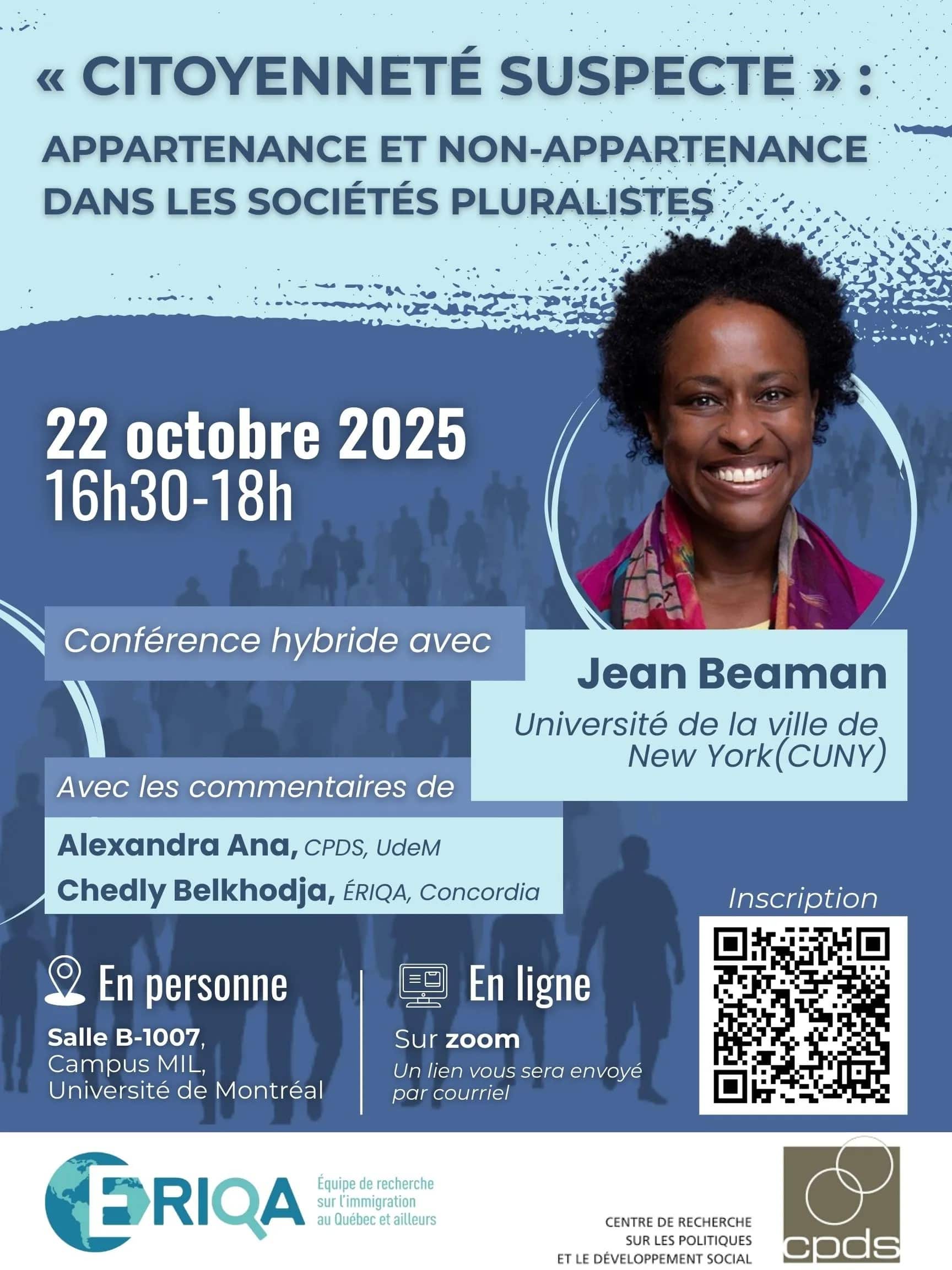 L’ÉRIQA et le Centre de recherche sur les politiques et le développement social (CPDS) vous invitent à assister à la conférence « “Citoyenneté suspecte”: appartenance et non-appartenance dans les sociétés pluralistes » que présentera Jean Beaman, professeure agrégée en sociologie à l’Université de la ville de New York (CUNY), le mercredi 22 octobre, de 16 h 30 à 18 h, à l’Université de Montréal au campus MIL (salle B-1007) et sur Zoom. La conférence sera suivie par des commentaires des professeur-es Alexandra Ana (CDPS et Département de sociologie, Université de Montréal) et Chedly Belkhodja (ÉRIQA et École des affaires publiques et communautaires, Concordia).