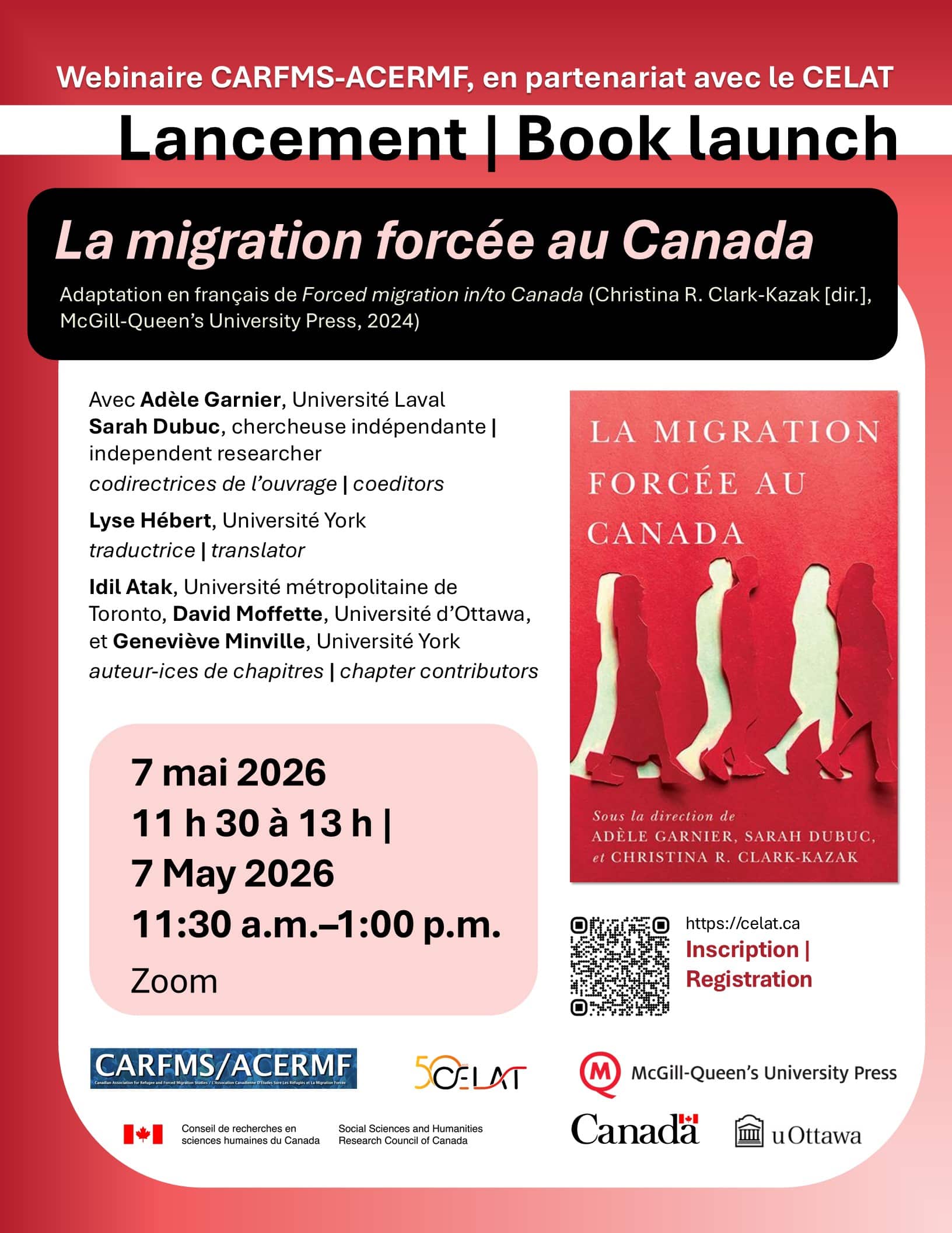 Afin de souligner la parution de La migration forcée au Canada, adaptation en français de l’ouvrage Forced migration in/to Canada (McGill-Queen’s University Press, 2024) dirigé par Christina R. Clark-Kazak, un lancement en ligne est organisé le jeudi 7 mai, de 11 h 30 à 13 h, par la Canadian Association for Refugee and Forced Migration Studies (CARFMS / ACERMF), en partenariat avec le CELAT. Un échange est prévu avec deux des codirectrices : Adèle Garnier (ULaval, CELAT) et Sarah Dubuc (chercheuse indépendante), la traductrice Lyse Hébert (Université York), et les contributeur-ices Idil Atak (Université métropolitaine de Toronto), David Moffette (Université d’Ottawa) et Geneviève Minville (Université York). Au plaisir de vous y voir!
