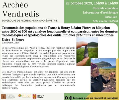 Dans le cadre du prochain Archéo-vendredi, Éloïse St-Pierre (Université Laval) fera une présentation intitulée « L’économie des populations de l’Anse-à-Henry à Saint-Pierre-et-Miquelon entre 2800 et 500 AA : analyse fonctionnelle et comparaison entre les données tracéologiques et typologiques des outils […]