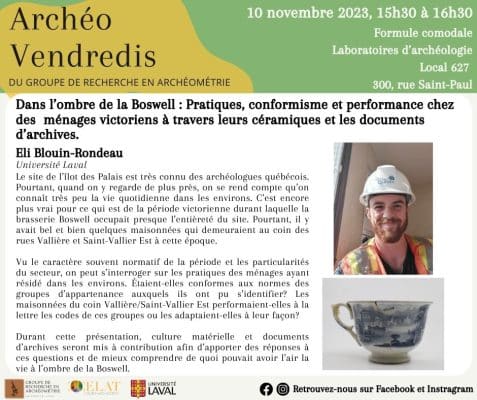 À l’occasion du prochain Archéo-vendredi, Eli Blouin-Rondeau (CELAT-UL et Ville de Québec) présentera la conférence « Dans l’ombre de la Boswell : pratiques, conformisme et performance chez des ménages victoriens à travers leurs céramiques et les documents d’archives » le […]