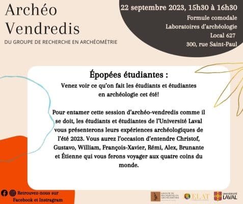 Mise à jour : L’évènement se déroulera dans la salle 627 des Laboratoires d’archéologie. À l’occasion du premier Archéo-vendredi de la session, prévu le 22 septembre, de 15 h 30 à 16 h 30, dans le local 627 des Laboratoires […]