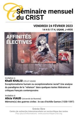 Khalil Khalsi (CELAT) présentera la conférence « Exceptionnalisme humain ou exceptionnalisme racial? Une analyse du paradigme de la “reliaison” dans quelques textes littéraires et critiques français contemporains » lors de la prochaine séance du séminaire mensuel du Centre de recherche interuniversitaire en […]