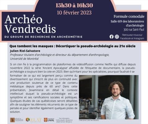 Julien Riel-Salvatore (Université de Montréal) présentera la conférence comodale « Que tombent les masques : décortiquer la pseudo-archéologie au 21e siècle » ce vendredi 10 février, de 15 h 30 à 16 h 30, dans la salle 619 des Laboratoires d’archéologie (300, rue […]