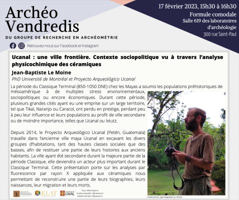 Dans le cadre des Archéo-vendredis, Jean-Baptiste Lemoine (Université de Montréal) présentera la conférence comodale « Ucanal : une ville frontière. Contexte sociopolitique vu à travers l’analyse physicochimique des céramiques » ce vendredi 17 février, de 15 h 30 à 16 […]