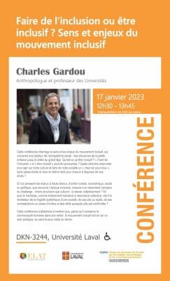 Le CELAT-UL est fier d’accueillir Charles Gardou, anthropologue et professeur des universités en France, qui a consacré ses travaux aux vulnérabilités et à leurs multiples expressions. Il offrira une conférence intitulée « Faire de l’inclusion ou être inclusif? Sens et […]