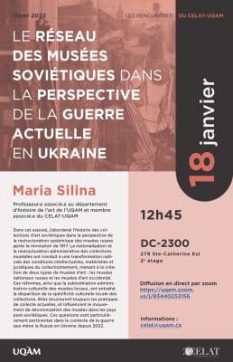 Notre membre associé-e Maria Silina présentera la conférence « Le réseau des musées soviétiques dans la perspective de la guerre actuelle en Ukraine » ce mercredi 18 janvier à 12 h 45 dans les locaux du CELAT-UQAM (salle DC-2300). La […]