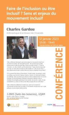 Le CELAT-UQAM est fier d’accueillir Charles Gardou, anthropologue et professeur des universités en France, qui a consacré ses travaux aux vulnérabilités et à leurs multiples expressions. Il offrira une conférence intitulée « Faire de l’inclusion ou être inclusif? Sens et […]