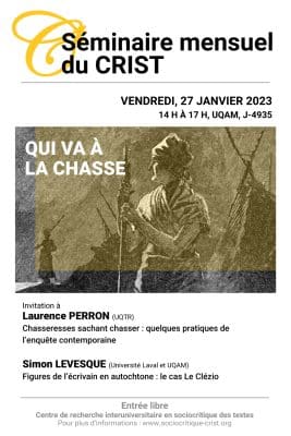 Simon Levesque, stagiaire postdoctoral au CELAT, présentera la conférence « Figures de l’écrivain en autochtone : le cas Le Clézio » dans le cadre de la prochaine séance du séminaire mensuel du CRIST, intitulée « Qui va à la chasse […]