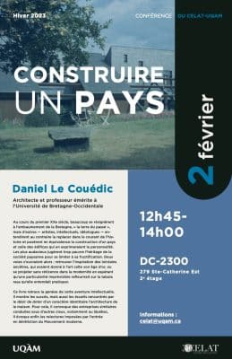 Le CELAT a le plaisir de vous inviter à une conférence de Daniel Le Couédic, architecte et professeur émérite à l’Université de Bretagne-Occidentale, autour de son ouvrage Construire un pays (Éditions du CRBC, 2020). Organisée en collaboration avec la Chaire […]