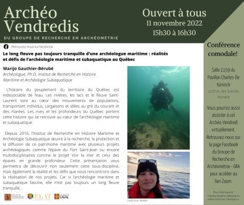 Dans le cadre des Archéo-vendredis, vous êtes invité-es à assister à la conférence comodale « Le long fleuve pas toujours tranquille d’une archéologue maritime : réalités et défis de l’archéologie maritime et subaquatique au Québec », que présentera Marijo Gauthier-Bérubé […]