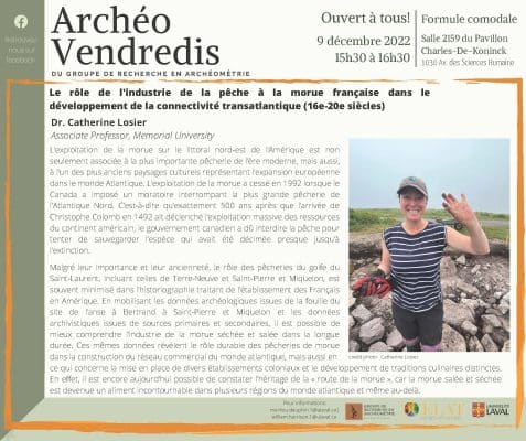 À l’occasion du dernier Archéo-vendredi du trimestre, Catherine Losier (Memorial University) présentera la conférence comodale « Le rôle de l’industrie de la pêche à la morue française dans le développement de la connectivité transatlantique (16e-20e siècles) » ce vendredi 9 décembre à […]