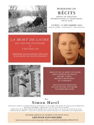 RéCITS, le Réseau de création international et transversal sur le soin, vous invite, le lundi 12 décembre à midi, à un webinaire offert par notre membre Simon Harel. « Intitulé “La mort de Laure. De l’œuvre posthume à l’œuvre-vie”, ce […]