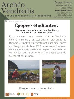 Le Groupe de recherche en archéométrie vous invite au premier Archéo-vendredi du trimestre! Intitulée « Épopées étudiantes », cette séance prévoit des présentations de plusieurs étudiant-es de 1er et 2e cycles, qui raconteront leurs expériences archéologiques de l’été 2022 au Québec et […]