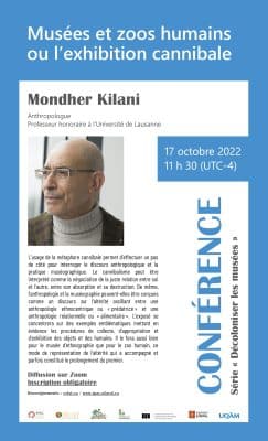 Le lundi 17 octobre 2022 à 11 h 30 (UTC-4), l’anthropologue Mondher Kilani (Université de Lausanne) présentera sur Zoom la conférence « Musées et zoos humains ou l’exhibition cannibale », dans le cadre de la série « Décoloniser les musées […]