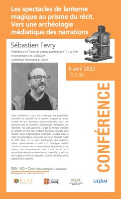 Le CELAT est heureux d’accueillir ce printemps un conférencier international; Sébastien Fevry (Université catholique de Louvain) fera une présentation intitulée « Les spectacles de lanterne magique au prisme du récit. Vers une archéologie médiatique des narrations » le mardi 5 […]