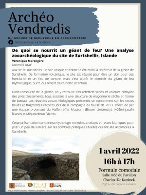 Véronique Marengère présentera la conférence comodale « De quoi se nourrit un géant de feu? Une analyse zooarchéologique du site de Surtshellir, Islande » ce vendredi 1er avril à 16 h. L’activité, qui s’inscrit dans le cadre des Archéo-vendredis, se déroulera au […]
