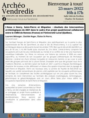 À l’occasion des Archéo-vendredis, Laurent Bélanger, Clotilde Roger (membre étudiante du CELAT codirigée par Allison Bain) et Éloïse St-Pierre présenteront la conférence comodale « L’Anse-à-Henry, Saint-Pierre et Miquelon : résultats des interventions archéologiques de 2021 dans le cadre d’un projet quadriennal collaboratif entre le […]