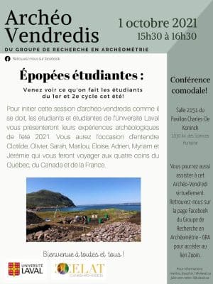 Dans le cadre des Archéo-vendredis, le Groupe de recherche en archéométrie vous invite, le vendredi 1er octobre à 15 h 30, à une rencontre sur le thème « Épopées étudiantes ». Clotilde, Olivier, Sarah, Marilou, Éloïse, Adrien, Myriamet Jérémie présenteront les expériences […]