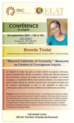 Le vendredi 24 septembre 2021, de 13 h à 14 h, l’Institut du patrimoine culturel (IPAC) et le CELAT vous convient à la conférence virtuelle « “Beyond Cabinets of Curiosity” : Museums as Centers of Courageous Inquiry », présentée (en anglais) par Brenda […]