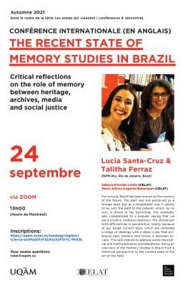 Dans le cadre de la série « Les temps qui viennent », le CELAT-UQAM vous invite à la conférence internationale « The Recent State of Memory Studies in Brazil. Critical Reflections on the Role of Memory Between Heritage, Archives, Media and Social Justice », […]