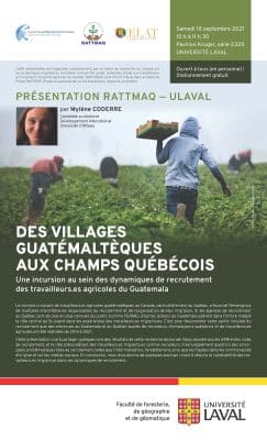 La Chaire de recherche du Canada sur les dynamiques migratoires mondiales (Université Laval), le Réseau d’aide aux travailleuses et travailleurs migrants agricoles du Québec (RATTMAQ) et le CELAT-ULaval vous convient à la conférence « Des villages guatémaltèques aux champs québécois », présentée […]
