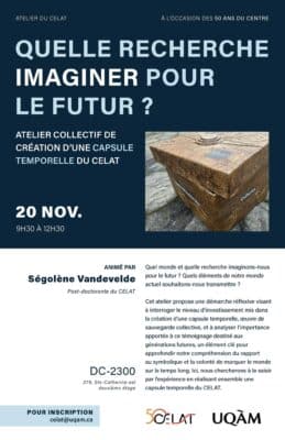 Les membres du CELAT sont invité-es à participer à l’activité « Quelle recherche imaginer pour le futur? », un atelier collectif et réflexif de création d’une capsule temporelle du CELAT, à l’occasion des 50 ans du Centre. Organisé et animé par Ségolène […]