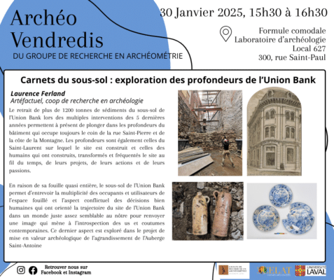 Le prochain Archéo-vendredi du Groupe de recherche en archéométrie aura lieu ce vendredi 30 janvier à 15 h 30 au local 627 des Laboratoires d’archéologie de l’Université Laval (300, rue Saint-Paul) et sur Zoom. L’archéologue professionnelle Laurence Ferland présentera le […]