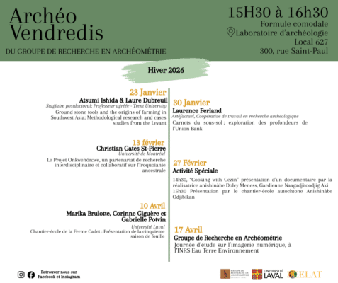 Le Groupe de recherche en archéométrie vous invite à assister au premier Archéo-vendredi du trimestre le 23 janvier à 15 h 30 au local 627 des Laboratoires d’archéologie de l’Université Laval et sur Zoom. Atsumi Ishida et Laure Dubreuil, respectivement […]