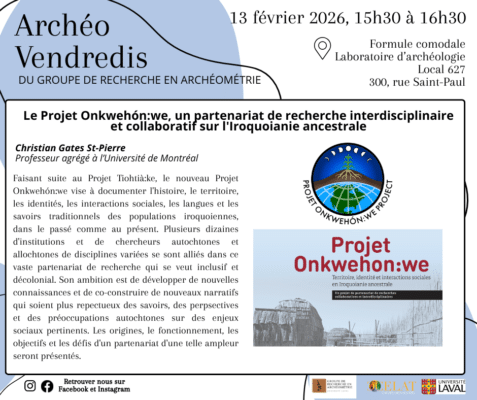 Le prochain Archéo-vendredi du Groupe de recherche en archéométrie aura lieu ce vendredi 30 janvier à 15 h 30 au local 627 des Laboratoires d’archéologie de l’Université Laval (300, rue […]