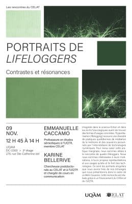 Dans le cadre de la série « Les rencontres du CELAT-UQAM », nos membres Emmanuelle Caccamo et Karine Bellerive présenteront une conférence sur les pratiques de lifelogging (hyperdiarisation) et les enjeux qu’elles […]