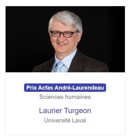 Lors du 78e Gala de l’Acfas, qui s’est tenu le jeudi 24 novembre au Grand Quai du Port de Montréal, notre membre Laurier Turgeon s’est vu remettre le prestigieux prix André-Laurendeau décerné par l’Acfas afin de célébrer l’excellence et le rayonnement des travaux et des actions d’un-e chercheur-e dans le champ des sciences humaines, lettres et arts. Nous le félicitons chaleureusement pour cet honneur!