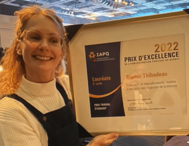 Dans le cadre des Prix d’excellence de l’administration publique décernés par l’IAPQ le 24 novembre 2022, notre membre étudiante Sophie Thibodeau, candidate à la maîtrise à l’Université de Montréal sous la direction de Bob White, a remporté un prix Travail étudiant pour son texte « Entre multi- et interculturalisme ; matière à confusion dans la gestion de la diversité ». Nous la félicitons! Cette distinction reconnaît la qualité remarquable d’un travail de recherche portant sur l’administration publique réalisé par des étudiant-es d’universités québécoises.